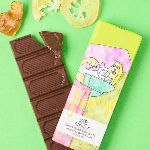 ●ジンジャーレモンチョコレートは、 筧 純爾さんの「ざっしゅのネコねてる」のアートワークがデザインされたパッケージ。